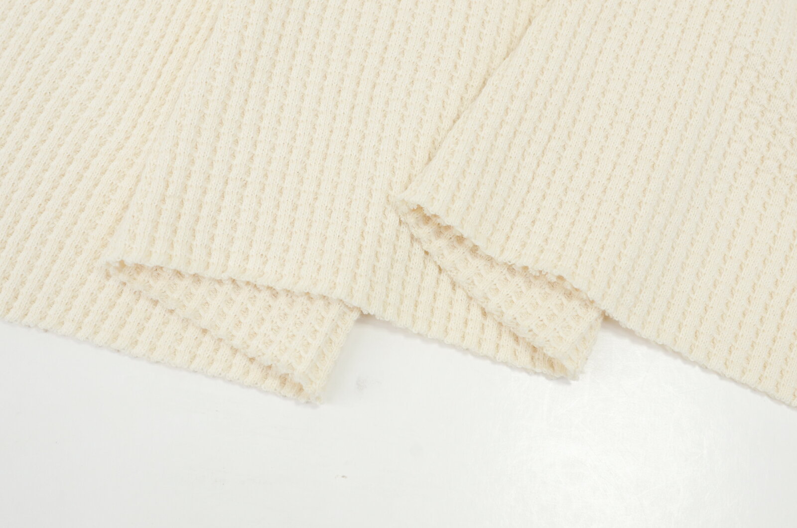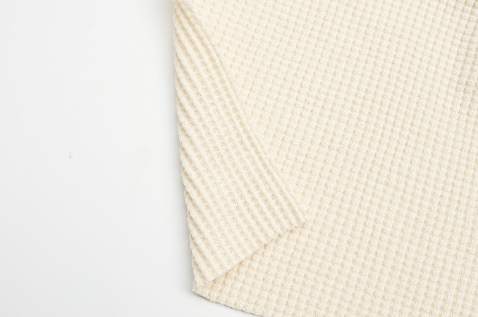 オーガニックコットン100%の天竺ニット生地と同じ糸を使用したワッフル素材が新発売!肉厚ありながら柔らかく編み上げたフワッとして気持ち良い肌触りになっています。