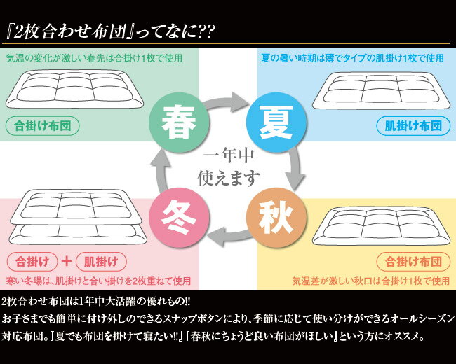 特徴 寝具 掛け布団2枚合わせ 敷き布団セット 通気性 クイーンサイズ 産地 日本 肌掛け サイズ:210×210(cm)綿量:1.1kg生地:ポリエステル80%、綿20%中綿:ポリエステル100%(クォロフィル・中空7穴構造)カラー:生成り 合掛け サイズ:210×210(cm)綿量:1.6kg生地:ポリエステル80%、綿20%中綿:ポリエステル100%(クォロフィル・中空7穴構造)カラー:生成り 敷布団 サイズ:160×200(cm)綿量:3.2kg生地:ポリエステル80%、綿20%中綿:ポリエステル100%(ホロフィル・中空4穴構造)カラー:生成り 仕様 肌掛けと合掛けのホックを着脱することでオールシーズンご利用頂けます。